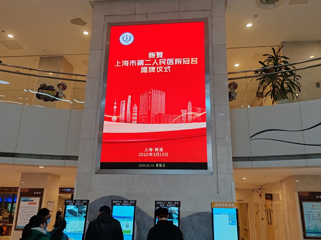 门诊大厅屏幕显示,3月15日将举办“恢复上海市第二人民医院冠名”揭牌仪式