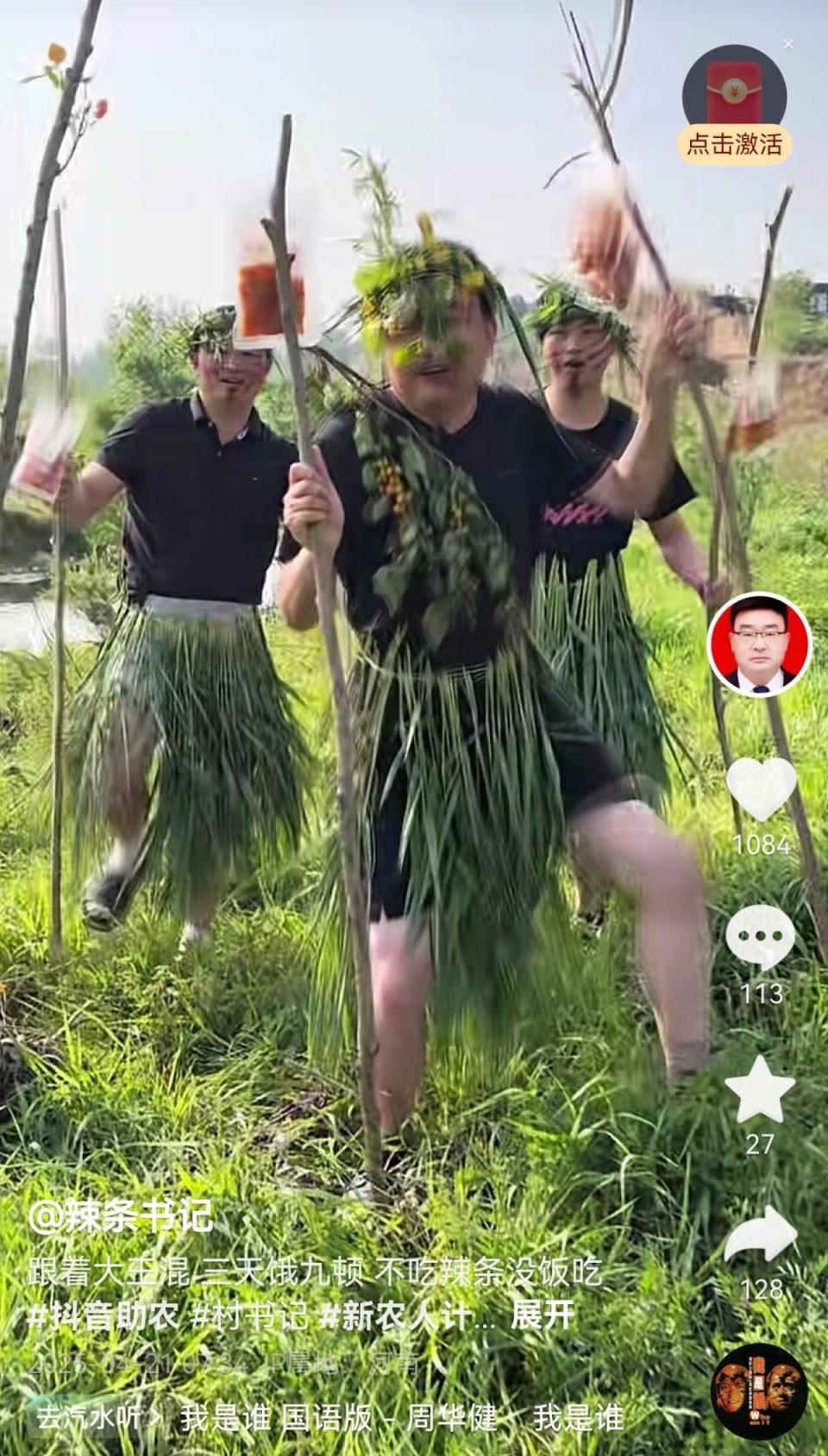 周根灿和另外两位村民身着短装,面涂彩绘,头戴枝条编的草帽,腰系绿草裙,手握长棍,迈着六亲不认的步伐,拍了一条 " 跟着大王混,吃香喝辣 " 的创意视频,既宣传公益,又推广辣条。" 当时好多人围着看热闹,跟看戏一样。" 那次拍摄后,他把心头影响发挥的 " 篱笆 " 拆了,彻底 " 放飞自我 "," 有流量,能带货,权当玩儿呗!"