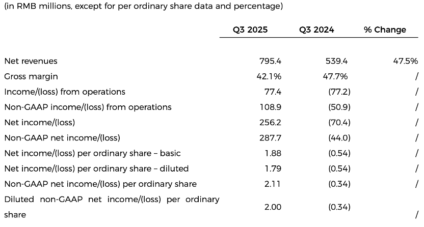 11月11日,禾赛科技(NASDAQ:HSAI;HKEX:2525)公布2025年第三季度财务数据。本季度,禾赛实现营收7.95亿元,同比增长47.5%,实现连续六个季度同比增长;净利润达到2.56亿元,创历史新高,提前一个季度完成其全年盈利目标;基本每股收益为1.88元。