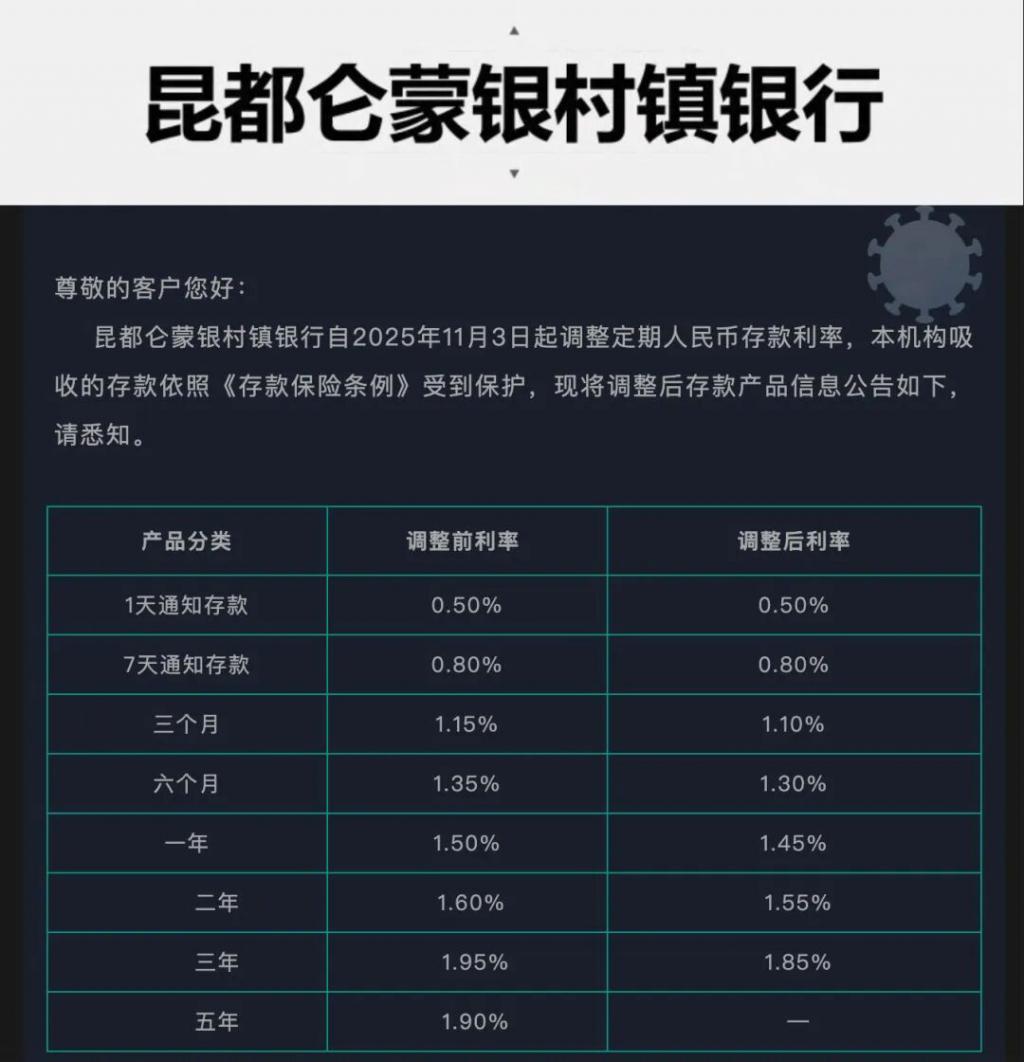 土右旗蒙银村镇银行的公告显示,本次调整不仅取消了五年期这一最长期限的定存产品,还同步下调了其他期限的利率:一年期和二年期定存利率均下调 5 个基点,分别降至 1.45% 和 1.55%,而三年期定存利率下调幅度最大,达 10 个基点,降至 1.85%。
