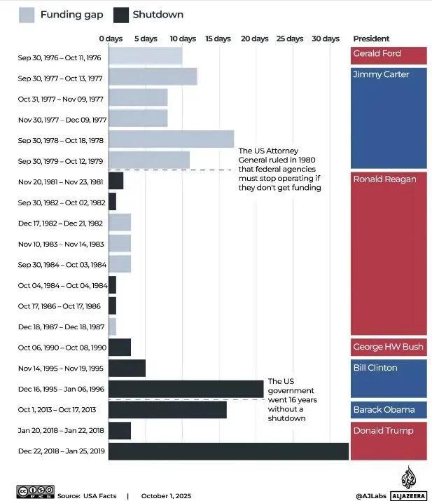 1976 年以来美国联邦政府面临资金缺口与正式停摆情况统计图表。图片来源:卡塔尔半岛电视台报道截图