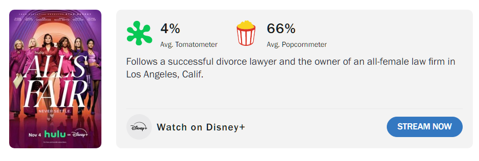 由金·卡戴珊、娜奥米·沃茨、莎拉·保罗森、格伦·克洛斯主演的律政剧《诉讼女王》(All's Fair),11月4日在迪士尼旗下的流媒体平台Hulu上率先放出了第一季的头三集。不承想,由艾美奖得主、《欢乐合唱团》和《美国恐怖故事》的幕后主脑瑞恩·墨菲打造的这部星光熠熠的九集迷你剧,很快就收到近年来最令人咋舌的负面评价,其中不乏零星差评。一时之间,几乎所有媒体都在讨论:现象级的《诉讼女王》会不会就是人类历史上最烂的一部电视剧?