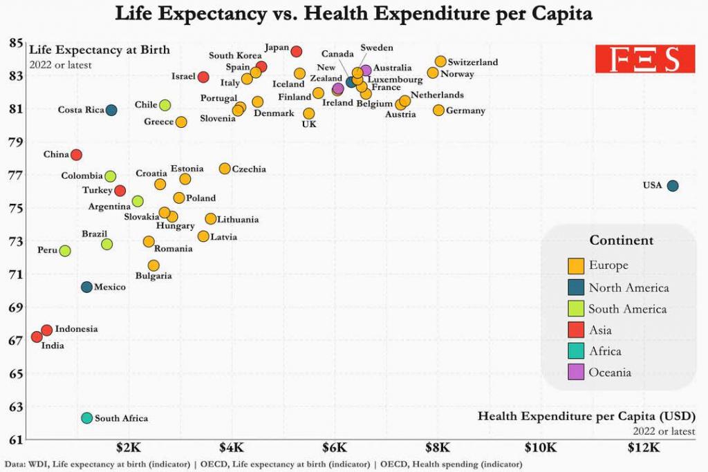 请看下图,这是经合组织统计的,全球各国预期寿命与人均健康支出的比较,在花钱方面,美国是断档式领先,平均每位国民每年要花超过 1.2 万美元来寻医问药,而美国人的预期寿命,却并没有很高,很多发达国家支出仅为美国的一半,预期寿命却比美国高了七八岁,就连花销仅 1K 美元出头的中国,预期寿命都高于美国 ……