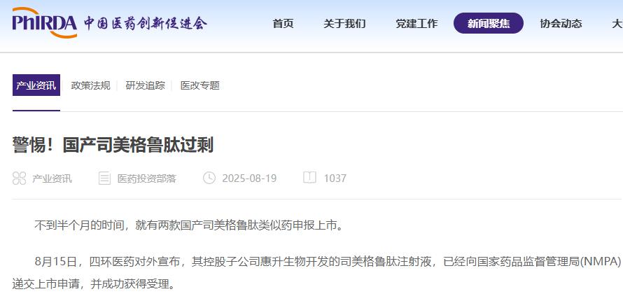 不过专利保护期是有限的,Wegovy,也就是司美格鲁肽,在中国和印度的专利在2026 年就要到期了,这两个东方神秘大国,都拥有庞大和高效的仿制药产业,已经跃跃欲试了。光是中国这边,公开报道中就有十几家药企在搞司美格鲁肽仿制药,杭州九源基因、丽珠集团、石药集团、华东医药、中国生物、齐鲁制药 …… 名单长到列都列不完,其中大部分等进入后期临床实验,只等获批了,有很大的希望在 2026 年集体上市。业内人士甚至认为,需要警惕国产司美格鲁肽过剩。