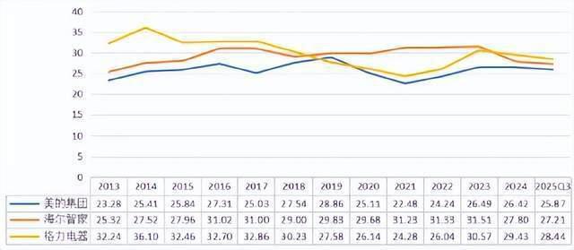 美的、海尔、格力近年来毛利率变化;数据来自 Wind