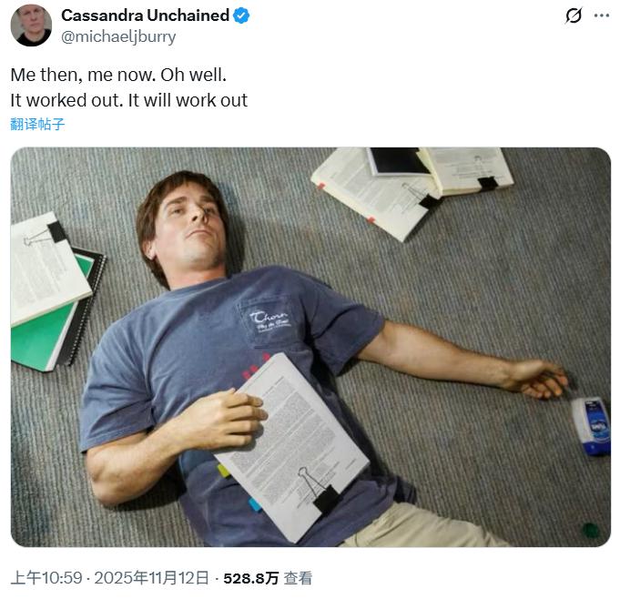 随后,贝瑞又在社交媒体上发布了一张 " 大空头 " 的剧照,隐喻 " 此时此刻正如彼时彼刻 ",而这一切终将水落石出。
