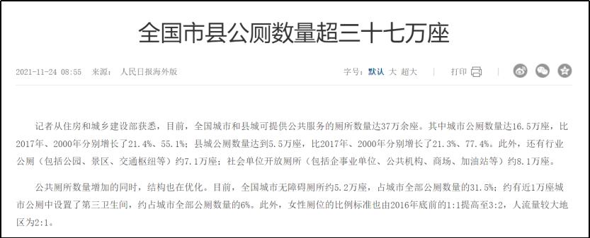 比如,2023 年,中国公共厕所数量达 20.15 万座,同比增长 4.05%。