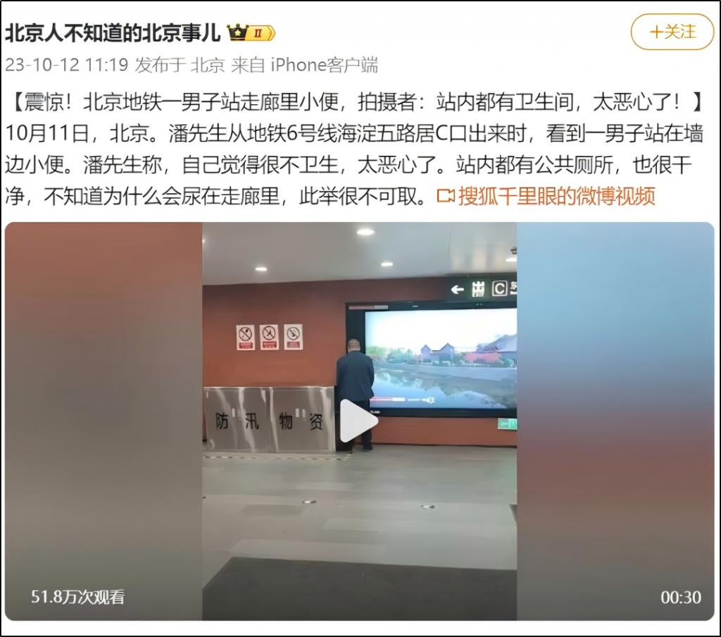 原来一名 41 岁的中国男子酒足饭饱下,在地铁站出口处旁若无人地尿尿。