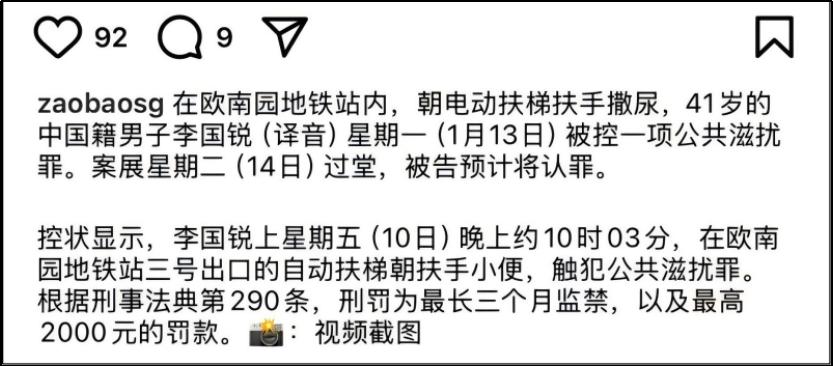 新加坡方面注意到了这件事,最后这名李姓男子触犯公共滋扰罪,被罚款 2000 新元(约等于 10750 元人民币)。