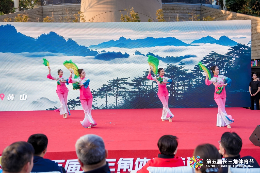 仪式正式启幕前,第五届长三角体育节广场舞大师赛率先点燃现场氛围,三省一市体育爱好者们共同见证赛事颁奖的荣耀时刻。闭幕式环节设计更是紧扣“全民共享”的理念,从文艺表演,到全民运动倡议宣读、文旅大礼包发放,再到会旗交接,呼应“群众体育”的赛事底色。尤其是开场的《融耀舞动长三角》舞蹈创意融合秀,将长三角四地风情及特色舞种融为一体,生动诠释了从“各美其美”到“美美与共”的区域体育融合理念。