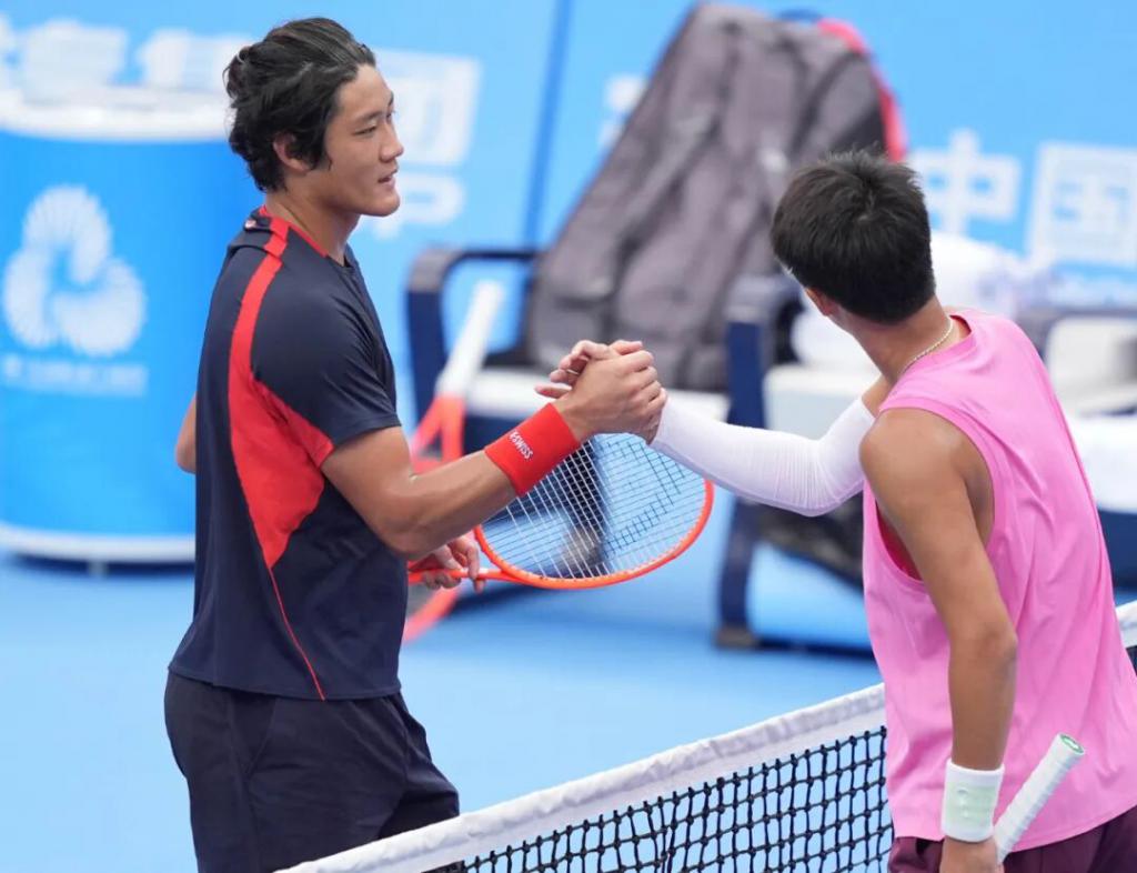 11 月 13 日,第十五届全国运动会网球项目男子单打第一轮在珠海横琴举行。上海队选手张之臻(左)与湖南队选手周洺舟在赛后握手致意。