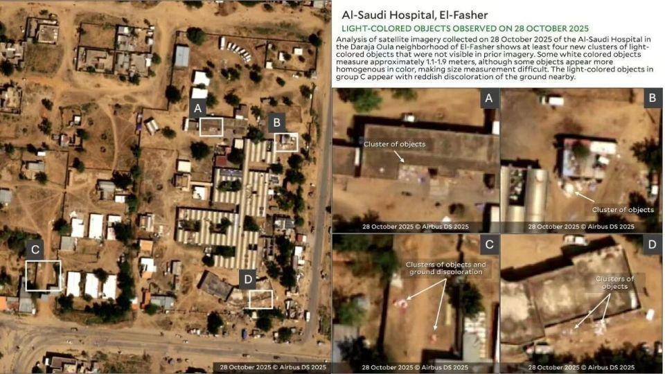 耶鲁大学人道研究实验室在社交平台发出的卫星图像显示,沙特医院附近出现的浅色物体聚集和地面红色变色