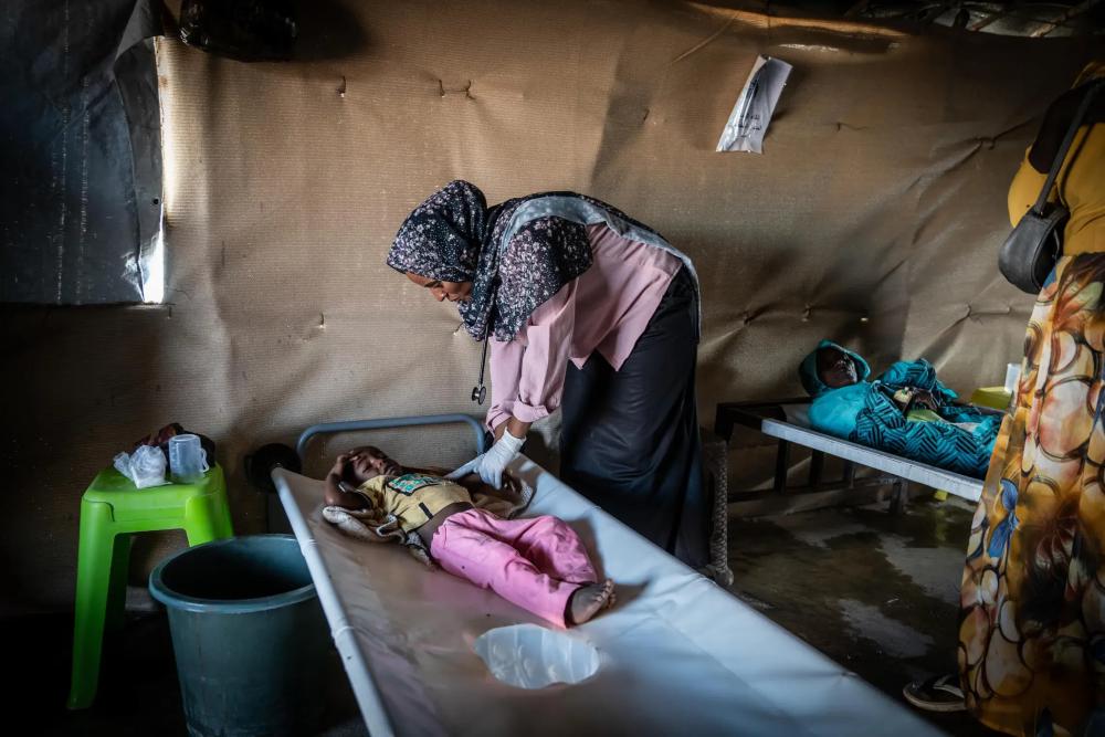 苏丹的一个流离失所者营地中,MSF(无国界医生)霍乱诊所的 Dr.Omnayat El Toom 正在为一名患有霍乱的儿童患者进行治疗 / 图源:联合国人道主义事务协调厅