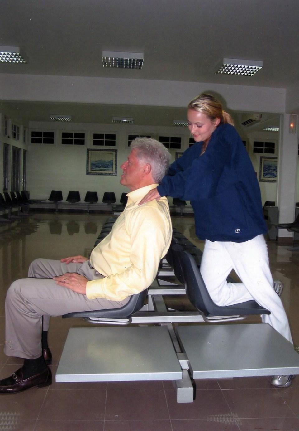 根据 2020 年外媒公布的一组照片,克林顿曾在 2002 年与爱泼斯坦一起访问非洲,并被拍到在葡萄牙的一个机场休息时,时年 22 岁的查塔特 · 戴维斯正在帮他按摩颈部。