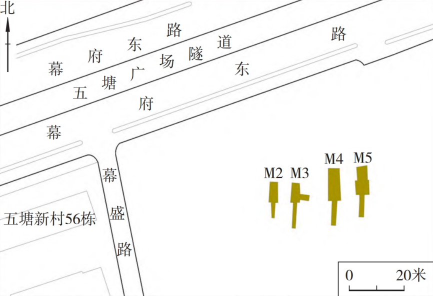 考察的第一站为伍佰村丁奉墓,墓葬所在区域位于南京市北郊幕府山南麓,共发现六朝时期砖室墓葬4座,墓葬均为南北向,东西并列分布,从西向东编号为2020NGWM2~5(以下简称M2~5),其中M3即为东吴大将丁奉墓。