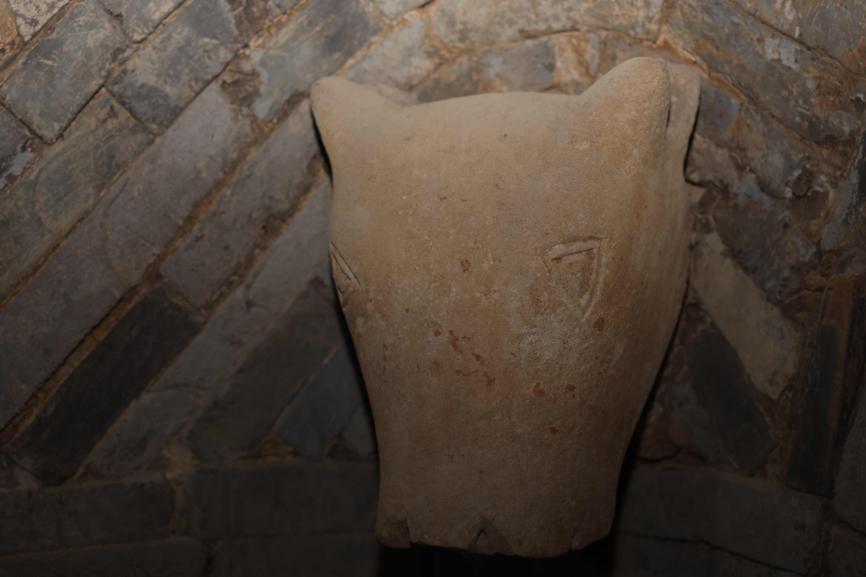 前室四角中部距墓底1.4米处各嵌一牛首形石雕,墓室建造时从四个牛首开始起券,形成方弧形圈砌结构,不仅创造了更大的墓室内部空间,更使墓顶抗压强度显著增强。此外,牛首也是摆放灯具的灯台,其中一个壁面残留有烟熏的痕迹。