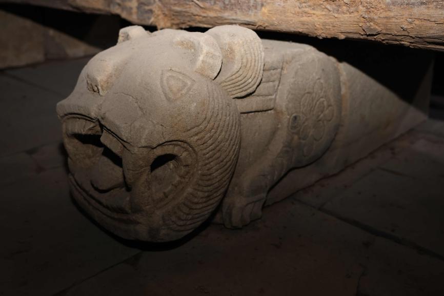 进入后室后部,中央摆放的两组四件石棺座赫然呈现在眼前。木棺在漫长的时间中已经朽坏,石棺座的两端雕凿有虎首与前蹄,石虎虎口大张、神态生动,前蹄上还刻有花瓣形纹饰,即使已经历经千年,我们似乎还能听到江东猛虎的怒吼在墓室中回响。