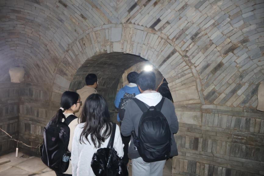 前室中部两侧有对称分布的长方形耳室,均为券顶,随着老师细致的讲解,同学们逐渐深入墓室,通过一段长约1.7米的过道行至后室。后壁底部有2个壁龛,四角距墓底约1.4米处亦有牛首形石灯台,后室中部偏前两侧有对称分布的长方形耳室。