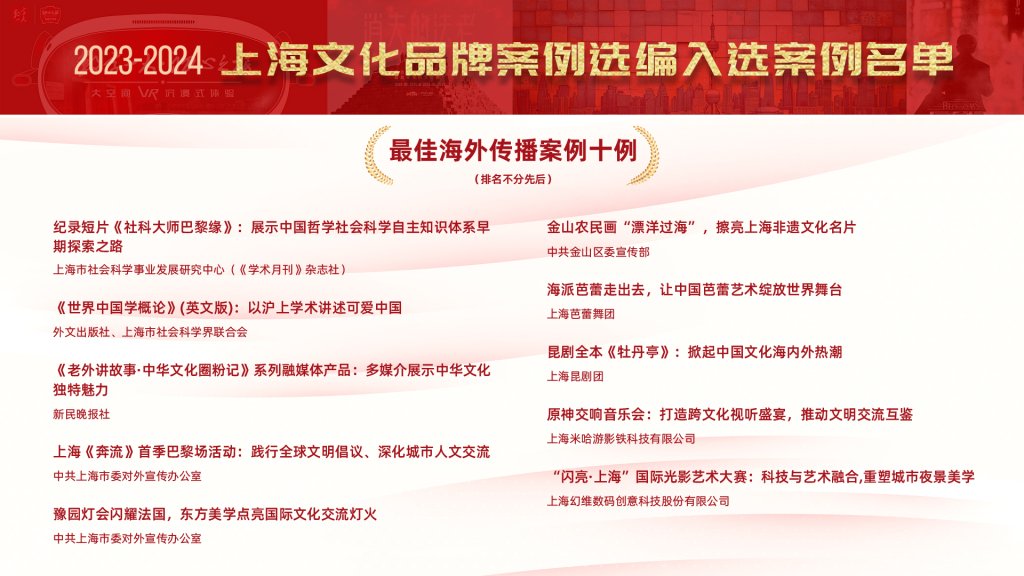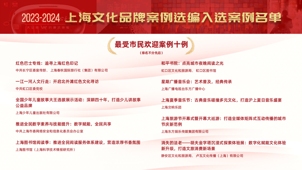 此次案例选编聚焦上海奋进建设习近平文化思想最佳实践地的生动实践,围绕用好用活红色文化、海派文化、江南文化的持续探索,以打造具有世界影响力的上海文化品牌为着力点,以深入落实《行动方案》“党的创新理论定向领航行动、‘党的诞生地’红色文化传承弘扬行动、城市精神品格固本培元行动、主流舆论凝识聚力行动、城市文脉赓续鼎新行动、公共文化惠民便民行动、文创产业聚变跃升行动、国际传播重塑重构行动、文化发展牵引赋能行动”9大行动、30项重点工程为脉络,共征集案例376个,较上一轮同比增加16%。围绕影响力、创新性、市民欢迎、融合发展、海外传播等五个维度,最终推选出2023-2024上海文化品牌最具影响力案例十例、最佳创新发展案例十例、最受市民欢迎案例十例、最佳融合发展案例十例和最佳海外传播案例十例。
