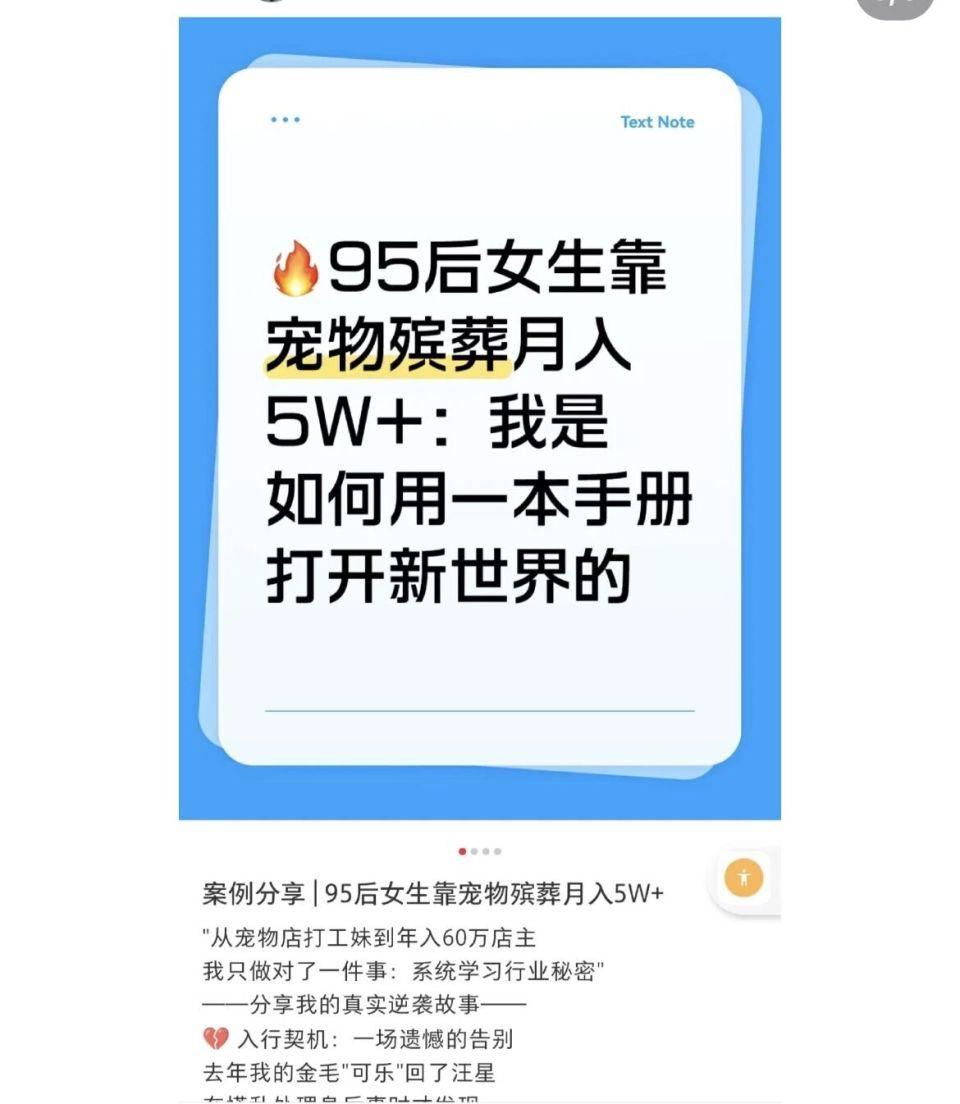 " 宠物殡葬创业:今日收入 8456!" 张斌在小红书上发布了一条这样的帖子,这是他每天工作任务的一部分—— " 编辑一个靠着宠物殡葬致富的小故事引流 "。张斌是一家宠物殡葬品牌加盟业务的销售人员,能否吸引到更多的咨询者、加盟者,和他工资直接挂钩。