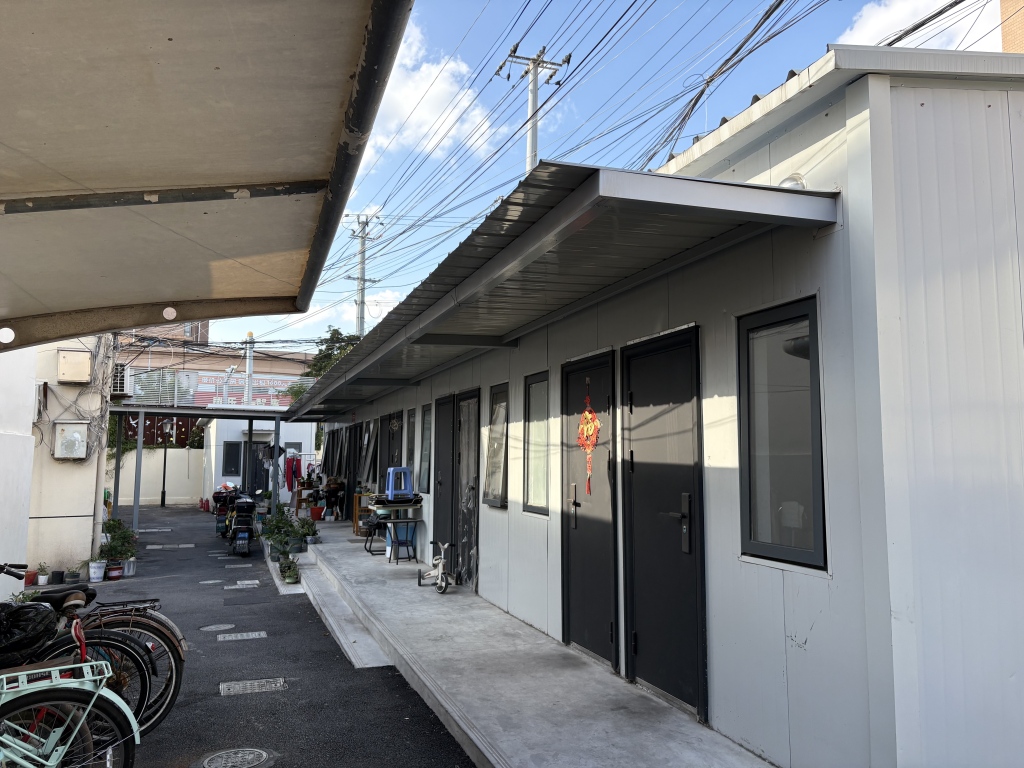 3层楼房无法贴墙扩建,因此在楼外统一建设轻质钢结构房屋作为厨卫。