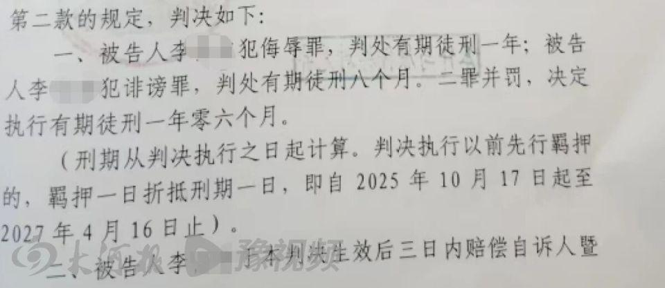 11 月 20 日,女孩母亲李女士告诉大河报《看见》记者,她与丈夫通过刑事自诉方式,起诉了网络暴力他们夫妇的网友李某。目前案件一审已宣判,李某因犯侮辱罪、诽谤罪,被判处有期徒刑一年六个月。