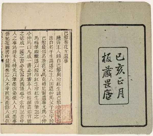 王寿昌口述、林纾笔译的《巴黎茶花女遗事》,清光绪二十五年(1899年)林氏畏庐原刻本