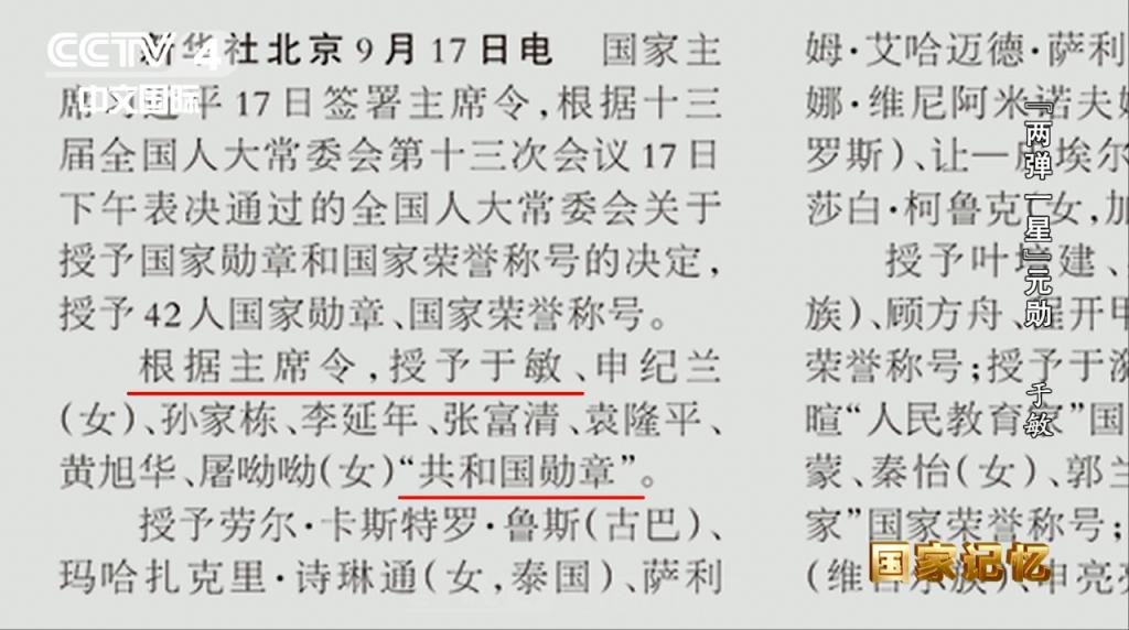 1999 年,于敏被国家授予 " 两弹一星 " 功勋奖章;2015 年,于敏获得 2014 年度国家最高科学技术奖。