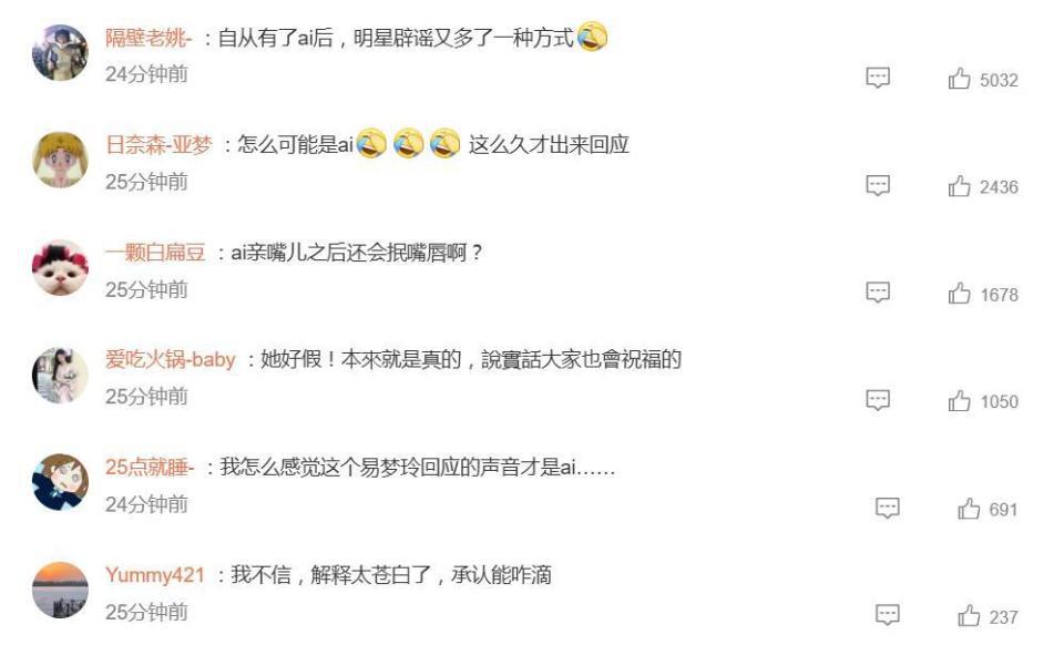 于是,舆论风向迅速分裂。一方认为,视频本身存疑,回应一下没毛病。但更多吃瓜群众则认为,易梦玲的回应完美避开了所有关键问题,属于 " 留后路式辟谣 "。网友们纷纷调侃:"AI 成了新一代明星辟谣万能背锅侠 "," 真要证明是 AI,为啥不甩出技术鉴定报告?"