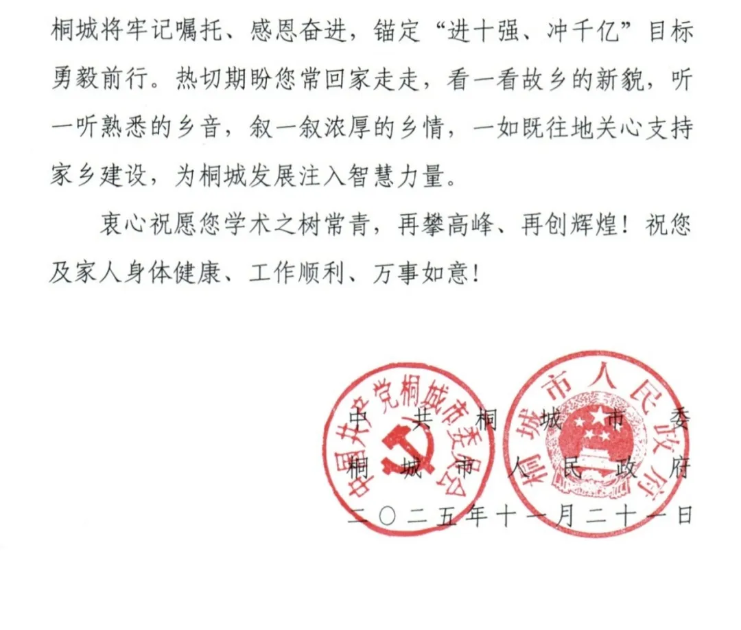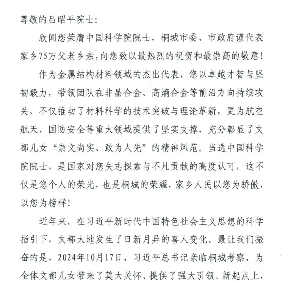 比如,桐城市委、市政府向吕昭平致贺信称,“当选中国科学院院士,是国家对您矢志探索与不凡贡献的高度认可,这不仅是您个人的荣光,也是桐城的荣耀,家乡人民以您为骄傲、以您为榜样”,“热切期盼您常回家走走,看一看故乡的新貌,听一听熟悉的乡音,叙一叙浓厚的乡情,一如既往地支持家乡建设,为桐城发展注入智慧力量”。