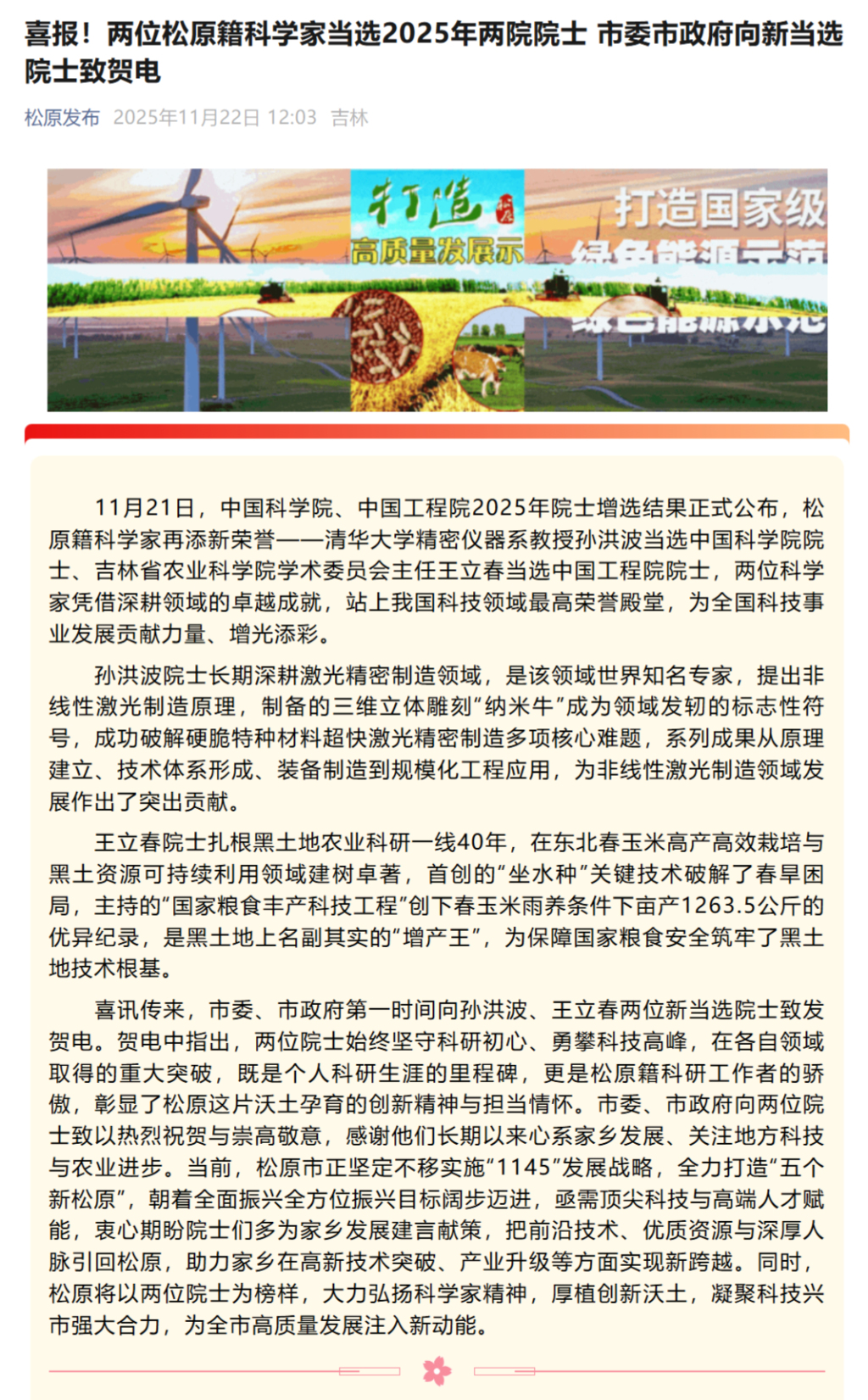 喜讯传来,松原市委、市政府第一时间向孙洪波、王立春两位新当选院士致贺电。贺电中指出,两位院士始终坚守科研初心、勇攀科技高峰,在各自领域取得的重大突破,既是个人科研生涯的里程碑,更是松原籍科研工作者的骄傲,彰显了松原这片沃土孕育的创新精神与担当情怀。