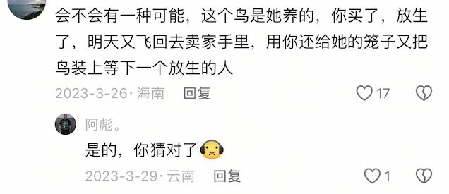 是的,放生早就成为无数人心照不宣的生意。早前有人发布了一条放生麻雀的视频,然而在评论区,早早有网友说出了 " 放生 " 的秘密:放生鸟本身就是买鸟人养的,今天被人买了放生,明天又飞回卖家,周而复始。