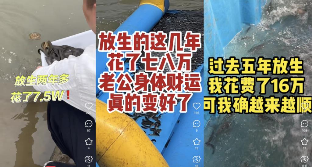 而近两年,随着社交媒体的发展,越来越多的人参与到 " 放生 " 活动中,他们将放生过程拍摄成视频发布在网络平台,希望 " 放生 " 能为自己带来福气和好运。