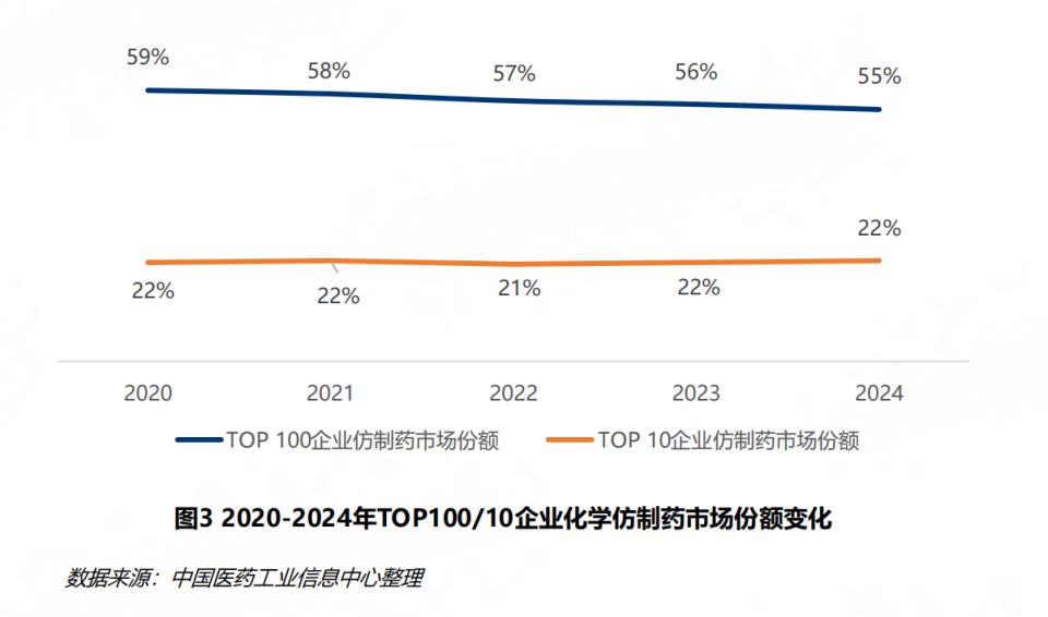 在市场集中度方面,报告认为,2024 年,化学仿制药市场中 Top10 企业如石药集团、齐鲁制药、恒瑞医药等市场份额合计稳定在 22% 上下,市场集中度仍然偏低。
