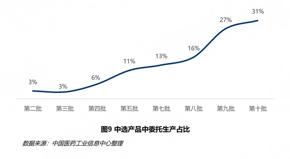 换言之,为了在集采市场上形成竞争优势,仿制药企需要考虑如何通过规模化生产降低制药成本,确保中选药品 " 降价不降质 "。对于小型仿制药企而言,他们中的一些可以通过较低的报价在集采中获得一席之地,但由于自身不具备生产能力,他们需要将集采中选药品进行委托生产。