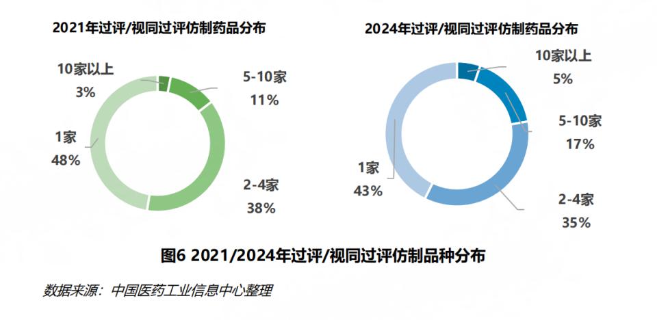 从药品维度出发,报告提到,2024 年,过评 / 视同过评的仿制药品种数达 914 个,相较 2021 年的 543 个大幅度增加。但报告同时显示,当年,70% 的过评 / 视同过评仿制药品种集中在 33% 的企业。同品种且有 5 家及以上企业过评 / 视同过评的仿制药数量由 2021 年的 79 个增加至 203 个,在同年仿制品种中的占比由 2021 年的 14% 增加至 22%。