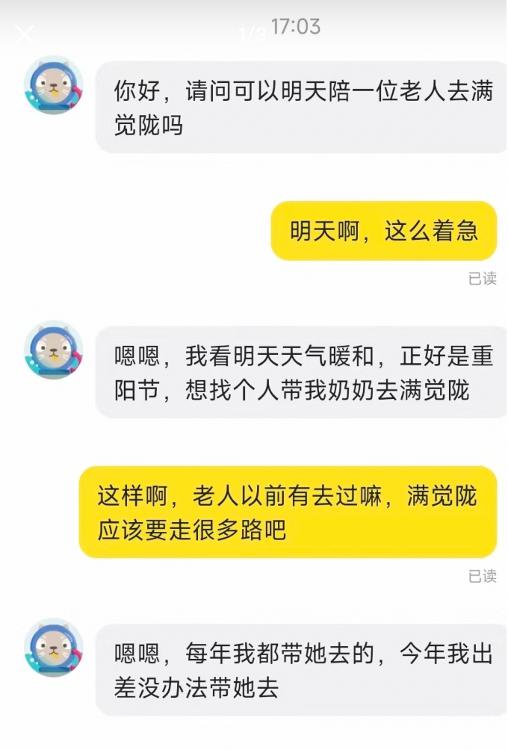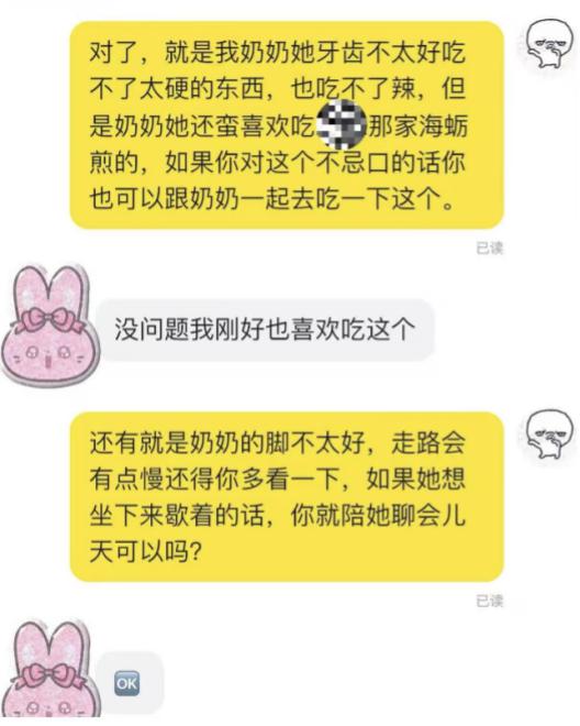 有人找到 " 外包孙女 " 后,会嘱咐他们注意事项,比如奶奶牙口不好,吃不了太硬、太辣的东西,奶奶喜欢吃某家小店的海蛎煎,希望可以陪同前往,还告知奶奶腿脚不好,走一段路,就需要休息一会。