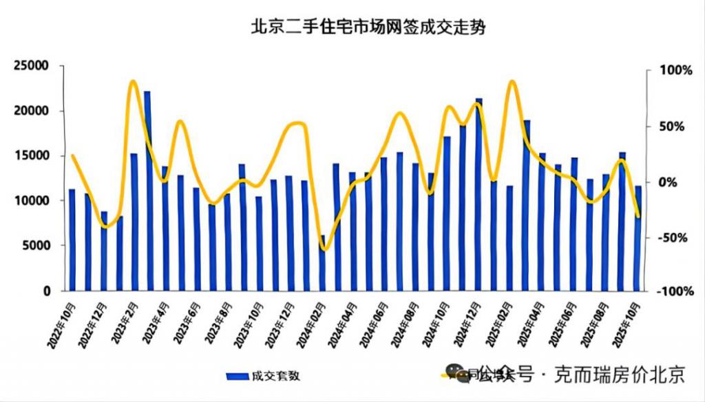 2025 年 1-10 月,北京二手房共计成交 142620 套,同比 2024 年前 10 个月上涨 5.4%。但今年下半年,链家内网的二手房挂牌量一直稳定在 14 万套上下,说明 " 买家数量回升,卖家数量也在增多 ",从个人到企业,都在出清手里 " 多余 " 的房产。