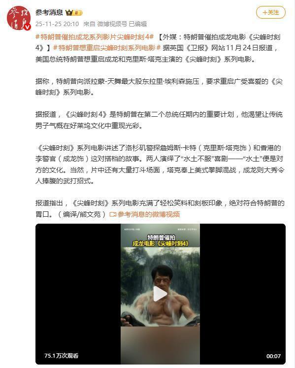 据 11 月 25 日报道,一则来自《卫报》的报道在影迷圈炸开了锅:美国前总统特朗普据称正亲自下场,向派拉蒙影业的最大股东拉里 · 埃利森施压,要求重启成龙与克里斯 · 塔克主演的《尖峰时刻》系列。这波操作被外界解读为特朗普意图在第二个任期内 " 重整好莱坞江山 " 的重要信号——他不仅要让传统男子气概重返银幕,更要复兴上世纪八九十年代风格的喧闹动作喜剧。