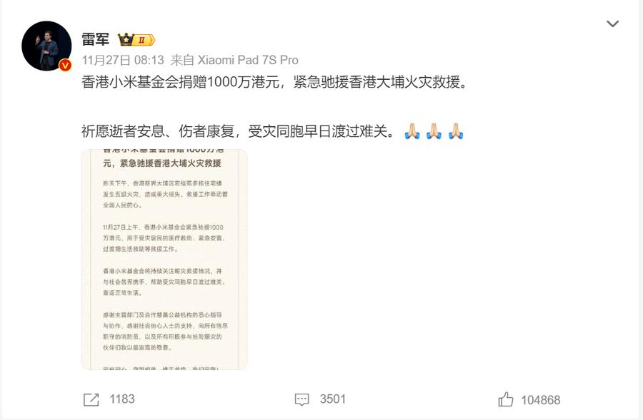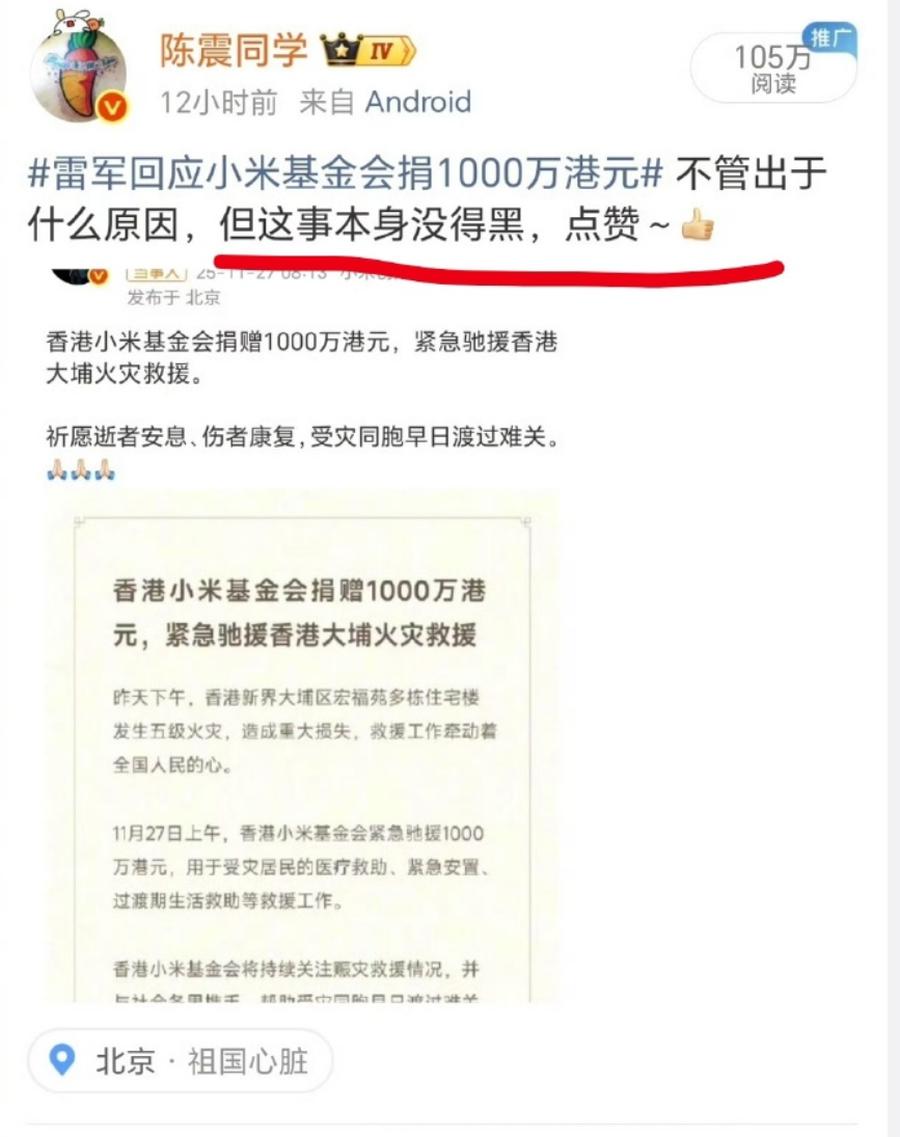 11 月 27 日,小米基金会向香港火灾捐赠 1000 万港元,举动引发了广泛关注。知名车评人陈震转发了这一新闻,并发表评论称:" 不管出于什么原因,但这事本身没得黑,点赞~"。其中的 " 不管出于什么原因 " 被不少网友解读为暗示小米捐款动机不纯。相较于阿里、腾讯等同类企业的捐款未受到陈震置评,只有小米被附加条件,许多人认为这是典型的双标行为。