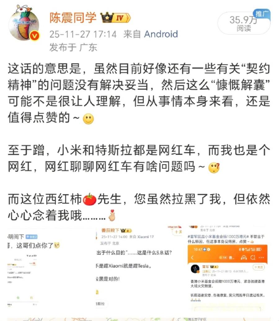 真跟小米杠上了?陈震为表述不清道歉,疑似阴阳小米捐款