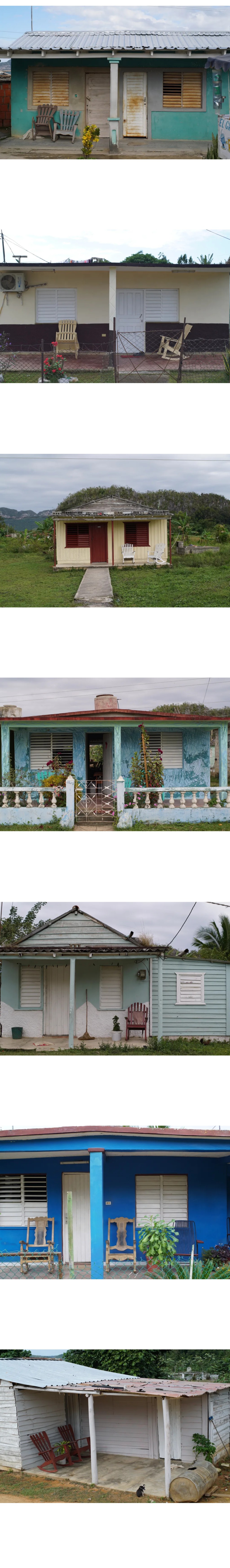 一排排五颜六色的房子立在山谷,每栋房子前都有两把或四把色彩、设计不同的躺椅,当然,他们的房子里还有更多这样的椅子。我被这些房子啊、椅子啊完全地吸引了,它们直接呈现了大部分古巴人轻松闲适的生活状态。坐在上面,晃啊晃啊,什么也不干,看看山和云,一天也就过去了。