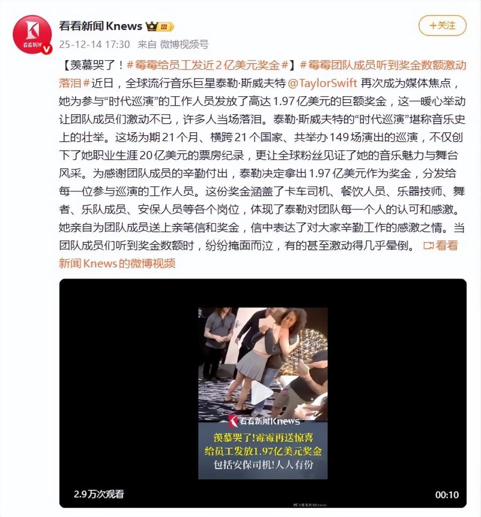 据 12 月 14 日报道,最近,全球顶流泰勒 · 斯威夫特(霉霉)又一次凭实力刷屏,但这次不是因为新专辑,而是一波 " 壕无人性 " 的暖心操作——她自掏腰包,给参与破纪录的 " 时代巡演 " 团队发放了高达 1.97 亿美元的巨额奖金。消息一出,团队成员们集体 " 破防 ",卡车司机激动落泪、伴舞掩面惊呼的画面瞬间火遍全网,被网友戏称为 " 真金白银的感恩教育 "。