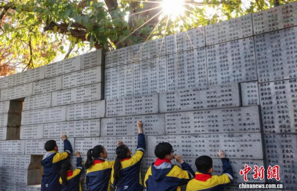 11 月 30 日,夏家亲属在侵华日军南京大屠杀遇难同胞纪念馆南京大屠杀遇难者名单墙 ( " 哭墙 " ) 前,为家族遇难的家属姓名描新。中新社记者 泱波 摄