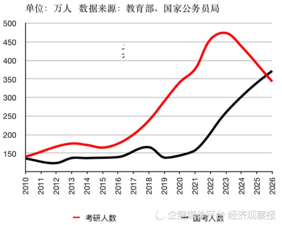在国考(国考为中央机关及其直属机构招录公务员考试,人数指通过用人单位资格审查的人数)人数连续多年低于考研人数后,2026 年,国考人数历史首次超过考研人数。