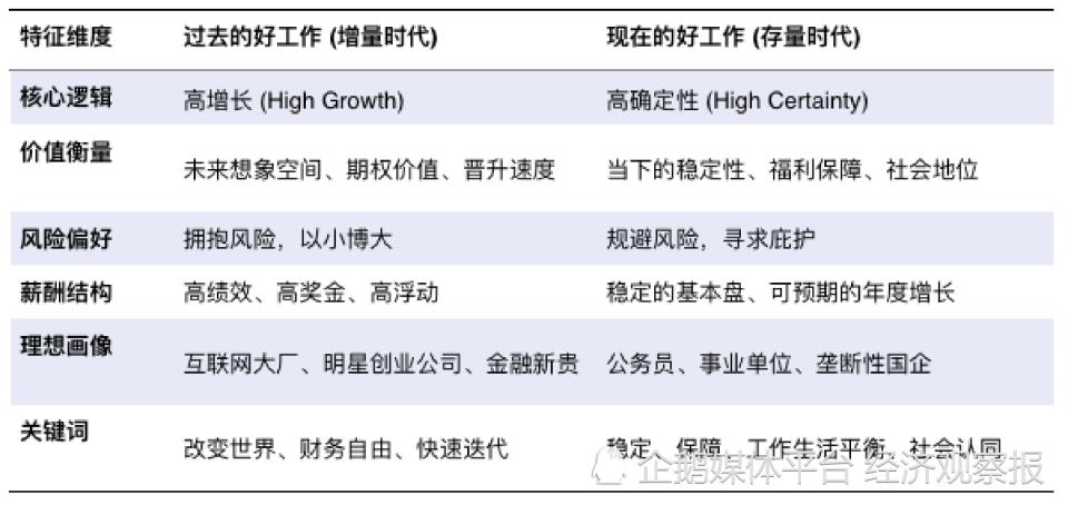 " 好工作 " 的定义永远是时代产物。当时代主题从 " 做大蛋糕 " 转向 " 分好蛋糕 " 时,年轻人从追逐 " 高风险、高回报 " 的机遇,转向寻求 " 高安全、稳收益 " 的岗位,是一种必然趋势。