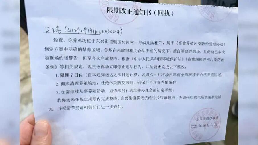 10 月 21 日,东兴街道办事处出具了一份限期整改通知书,上面显示," 经查,养鸡场位于东兴街道辖区付岗村,与幼儿园相邻,属于《畜禽养殖污染防治管理办法》划定方案中明确的禁养区域。你场在未取得相关合法手续的情况下,擅自筹建养鸡场,且此前已多次被现场约谈警告,但至今未完成整改。根据《中华人民共和国环境保护法》《畜禽规模养殖污染防治条例》等相关规定,现责令你场立即停止违法行为 "。