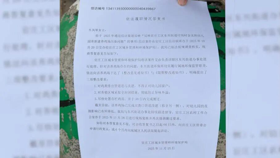 问题没有解决,牛女士又把问题反映到了河南省信访办。11 月 25 日,南阳市官庄工区城乡管理和环境保护局出具了一份答复书,上面显示,官庄工区城乡管理和环境保护局将该案件交由负责该辖区东兴街道办事处进行处理,并对养鸡场明确提出了三项整改要求:对鸡粪排出管道进行改建,不得正对幼儿园窗户;对养殖区域采取全封闭措施,彻底防止异味外溢;尽快处置存栏鸡苗,并于 30 日内完成搬迁。