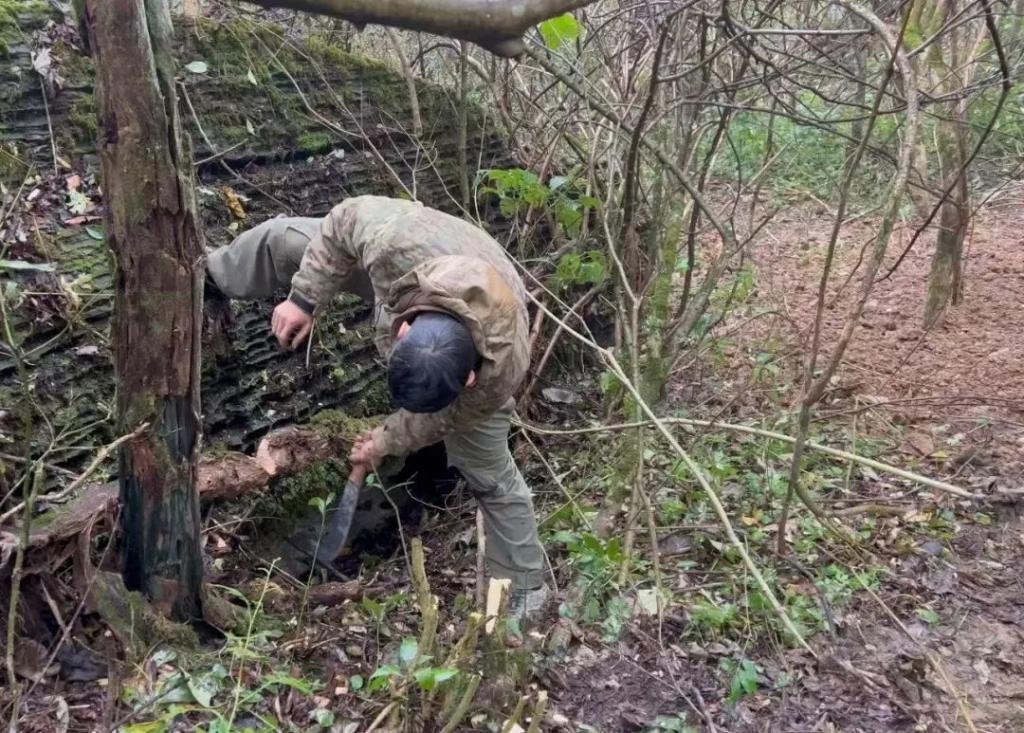 空间狭窄,挖掘工作只能从 " 卧姿 " 开始——他在部队训练的 " 卧姿构筑掩体 " 派上了用场,只是这一次没有工兵铲,只有双手和一把柴刀。