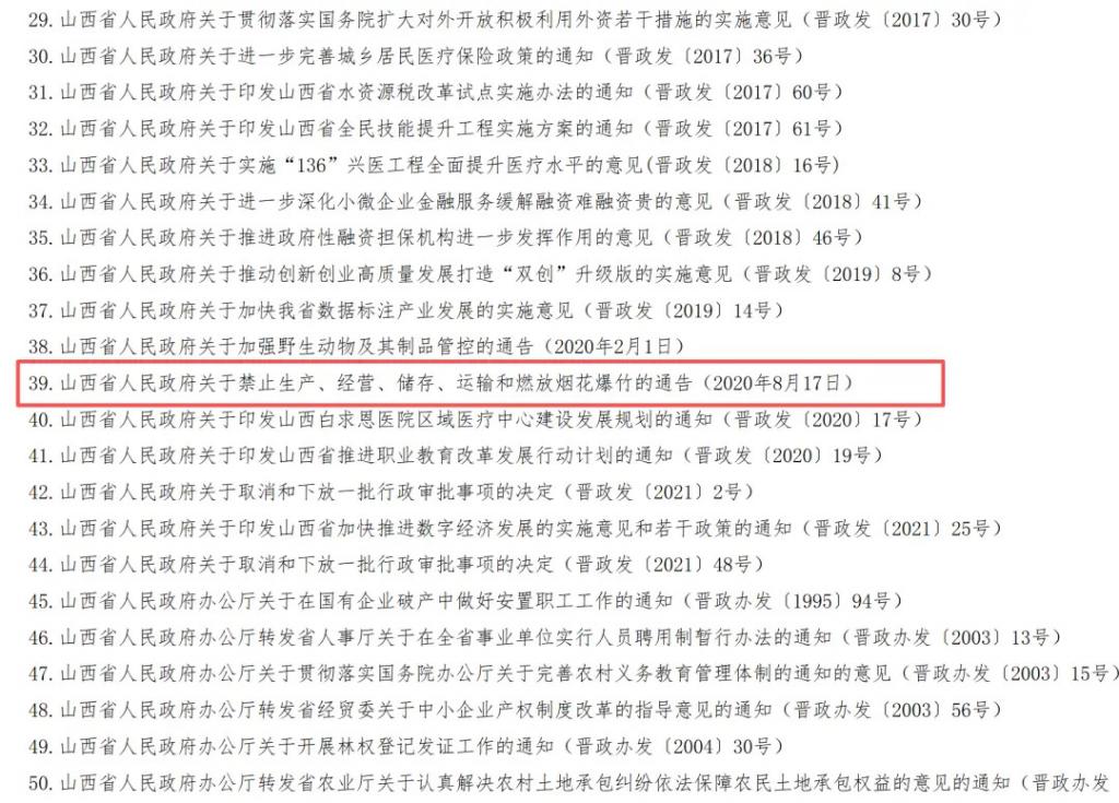 近日,山西省人民政府发布《山西省人民政府关于宣布废止 124 件行政规范性文件的决定》,宣布废止的行政规范性文件目录包含《山西省人民政府关于禁止生产、经营、储存、运输和燃放烟花爆竹的通告(2020 年 8 月 17 日)》。